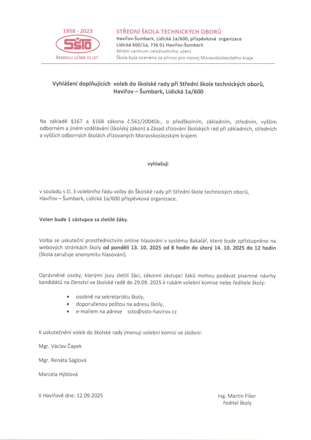 Vyhlášení doplňujících voleb do školské rady 2025