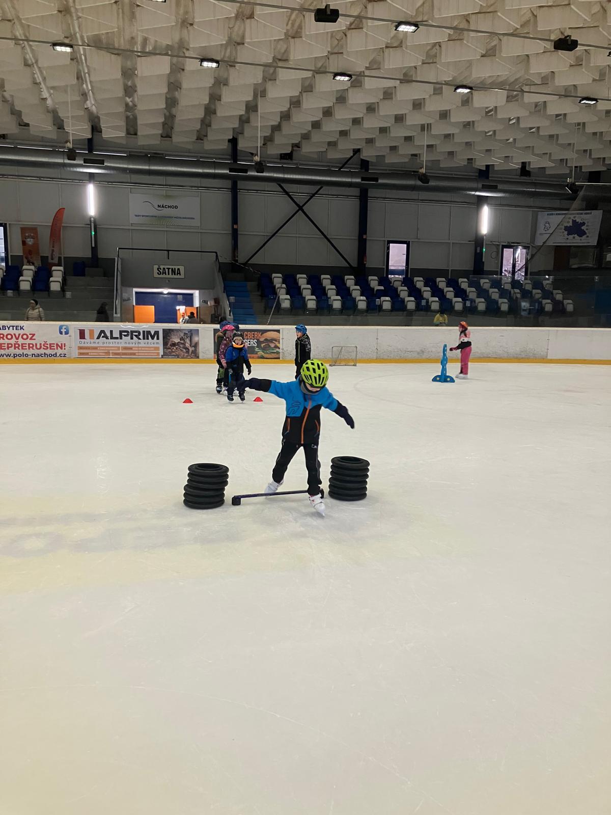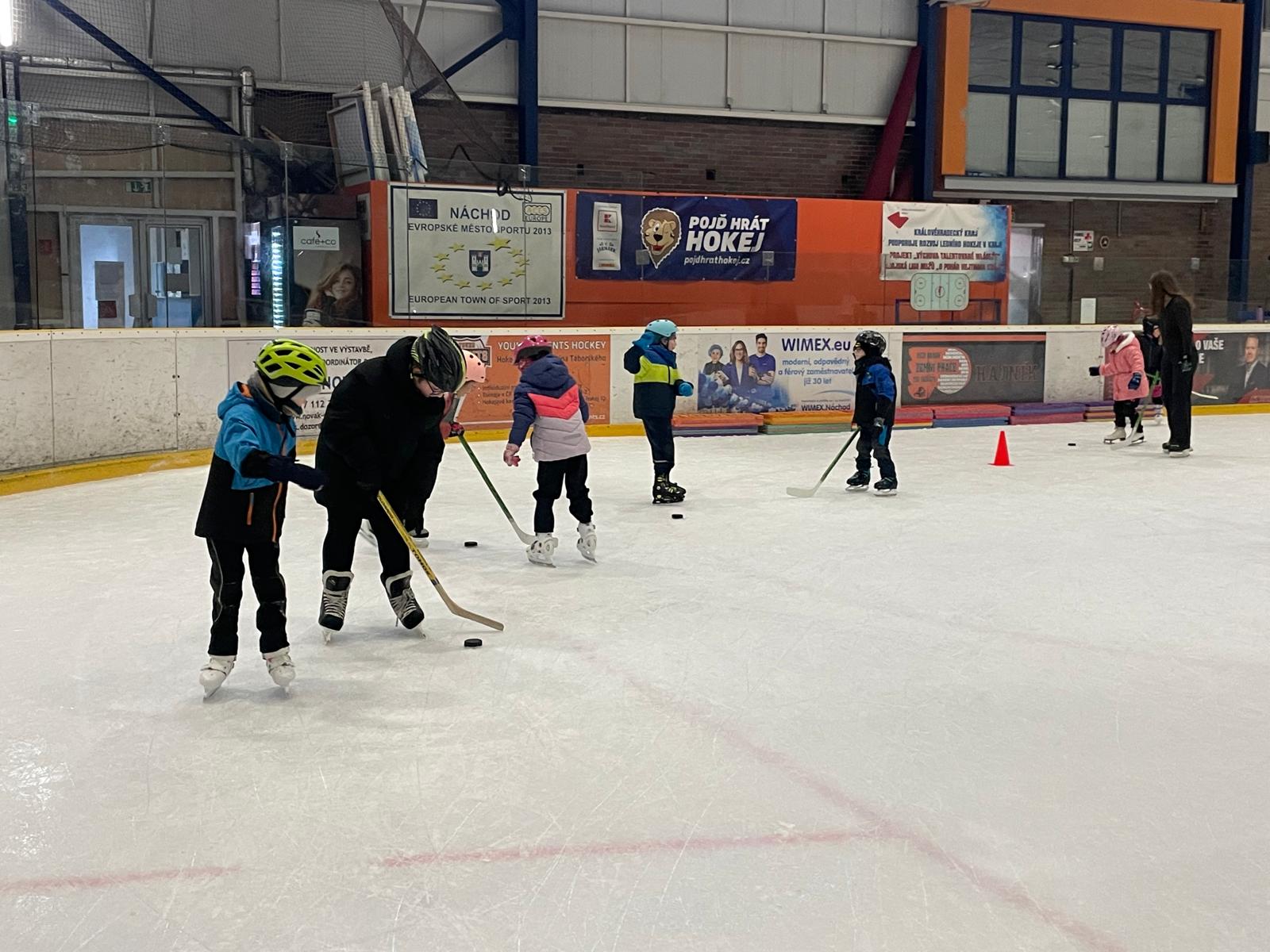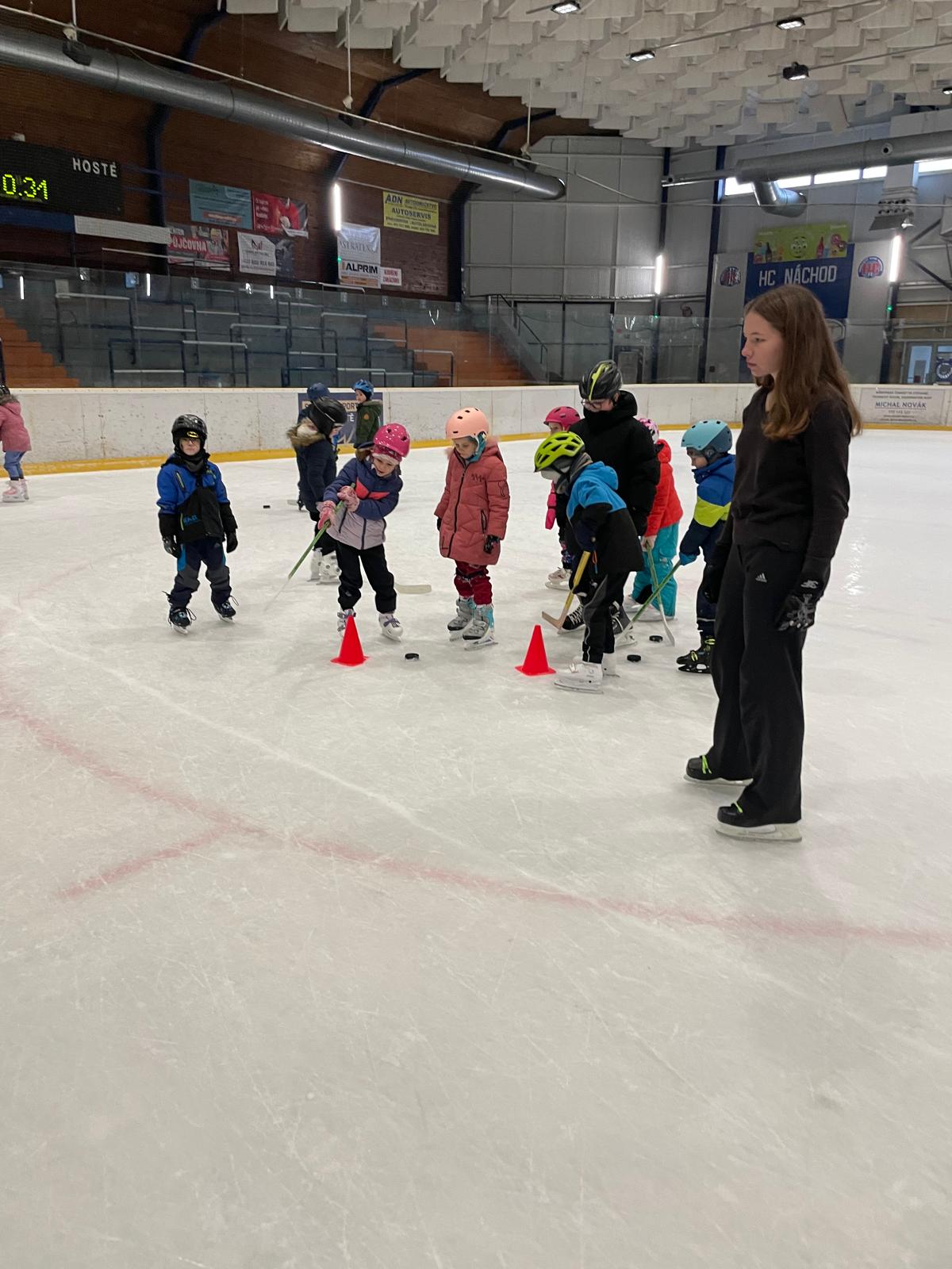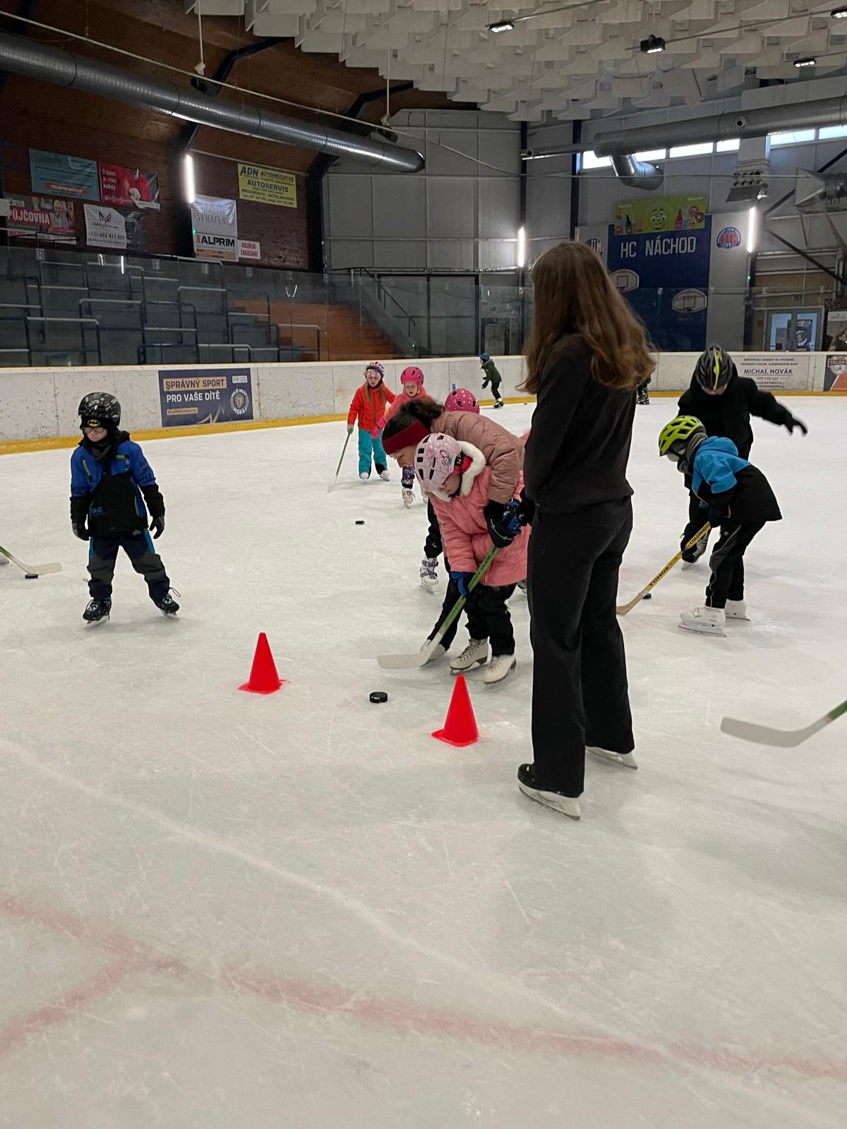 Bruslení - hokej, vedení puku, nahrávky, překážky.