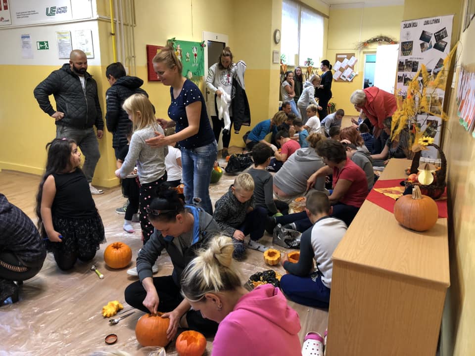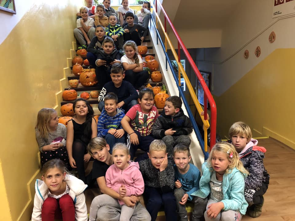 Žáci si vydlabali za pomoci rodičů dýně a poté si ve třídě vyrobili strašidelné zápichy do květináčů.
